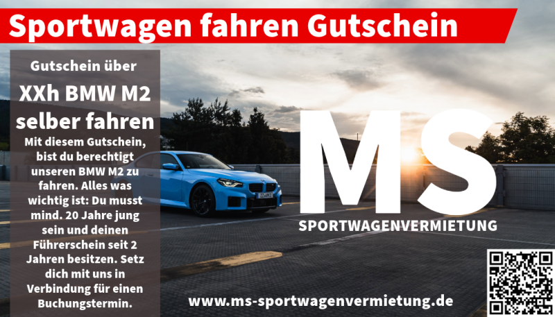 Dann sind unsere Gutscheine genau das Richtige für dich. Verschenke eine Tour mit unserem BMW M2 an deine Liebsten. Ganz individuell, ob für einen Tag oder mehrere Tage, mit oder ohne Kilometerpakete. Schreib uns eine Nachricht, und wir finden den perfekten Gutschein für dich. Diesen kannst du selbst ausdrucken und noch am selben Tag verschenken. Damit rechnet niemand! Verschenke jetzt ein unvergessliches Abenteuer.